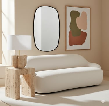 Key Elements: Pebble-shaped sofas, raw travertine tables, asymmetrical mirrors. These pieces mimic shapes found in nature, creating a soft, welcoming feel even in a modern space.