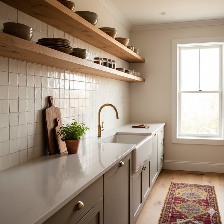 Key Elements: Open oak shelving (to display your beautiful, unique dishware), hammered-brass faucets, zellige tile backsplashes. These elements add personality and character, making the kitchen feel like the heart of the home.